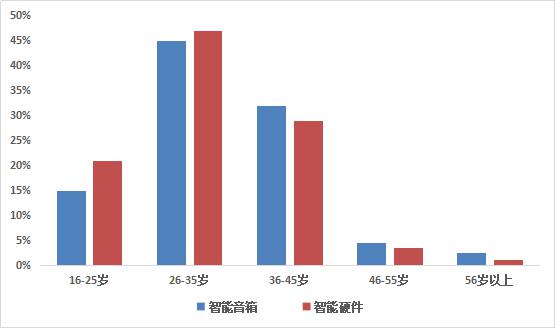 從上述圖表中可以看出,智能音箱用戶主要集中在26-45歲人群,其中36-45歲人群占比高于智能硬件用戶。