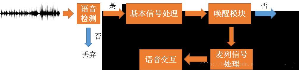 總體而言,音箱工作時(shí),麥列始終處于拾音狀態(tài)(持續(xù)對(duì)聲音信號(hào)進(jìn)行采樣、量化)。經(jīng)過基本的信號(hào)處理(靜音檢測(cè)、降噪等),喚醒模塊會(huì)判斷是否出現(xiàn)喚醒詞。如果出現(xiàn)喚醒詞,后續(xù)語音會(huì)進(jìn)行更復(fù)雜的語音信號(hào)處理,(理想情況下)得到干凈的語音信號(hào),開始真正的語音交互流程。