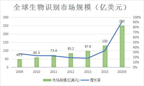 圖1 全球生物識(shí)別市場(chǎng)規(guī)模(億美元)
