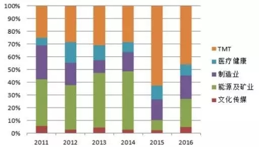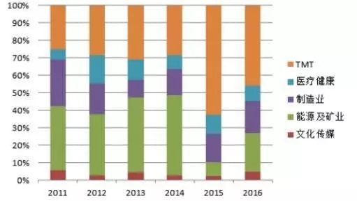 在國內 PE 投資方面,2016年TMT 行業(yè)投資熱度有所降低,但這與 2016 年市場整體投資節(jié)奏放緩有一定關系。如果從投資 的行業(yè)占比來看,TMT 和制造業(yè)仍然是最受投資機構追捧的領域。