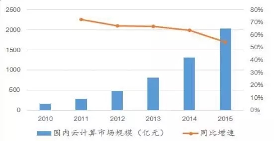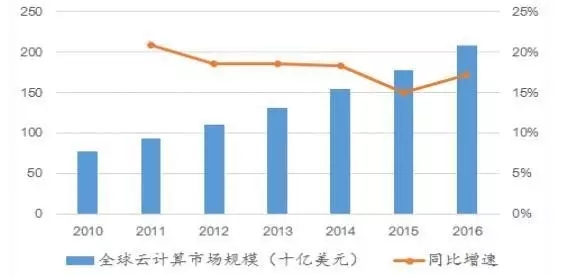 2016 年全球云計算市場規(guī)模達到 2086 億美元,同比增長 17.19%;從 2010 年至 2016 年,全球云計算的年 均復合增速達到 18.08%。而國內云服務市場規(guī)模從 2010 年至 2015 年年均復合增速為 64.74%,領先全球增速。