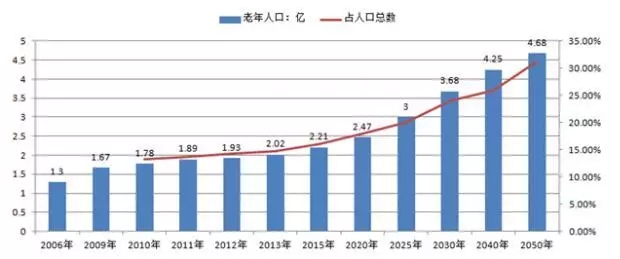2004年底,中國60歲及以上老年人口為1.43億,2013年我國60歲及以上老年人口達(dá)2億人。截止2016年底,我國60歲以上的老齡人口高達(dá)2.3億人,位居世界之首。20世紀(jì)后期,為控制人口的急劇增長(zhǎng),國家推行計(jì)劃生育政策,使得人口出生率迅速下降,加快了中國人口老齡化的進(jìn)程。由于下世紀(jì)前半葉人口壓力仍然沉重,還要繼續(xù)堅(jiān)持計(jì)劃生育的國策,其結(jié)果將不可避免地使中國提早達(dá)到人口老齡化高峰。在第六次全國人口普查主要數(shù)據(jù)顯示,我國60歲及以上人口占13.26%,比2000年人口普查上升2.93個(gè)百分點(diǎn),其中65歲及以上人口占8.87%,比2000年人口普查上升1.91個(gè)百分點(diǎn),而且老年人口比例還以每年超過3%的速度增長(zhǎng),預(yù)計(jì)2025年將達(dá)到19.7%,到那時(shí),每五個(gè)中國人就有一個(gè)是60歲以上的人。按國家統(tǒng)計(jì)局2005年出版的報(bào)告,現(xiàn)在出生的中國人,男性平均壽命是69.6歲,女性的預(yù)期壽命是73.5歲。