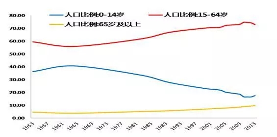 65歲以上老年人占總?cè)丝诘谋壤龔?%提升到14%,發(fā)達(dá)國家大多用了45年以上的時(shí)間。中國只用27年就可以完成這個(gè)歷程,并且將長(zhǎng)時(shí)期保持很高的遞增速度,屬于老齡化速度最快國家之列。預(yù)計(jì)到2045年左右,中國60歲以上人口將占到總?cè)丝诘?0%。該過程發(fā)達(dá)國家用了100年。圖2為1953年到2013年60年的人口比例變化情況,中國的高齡化趨勢(shì)明顯。
