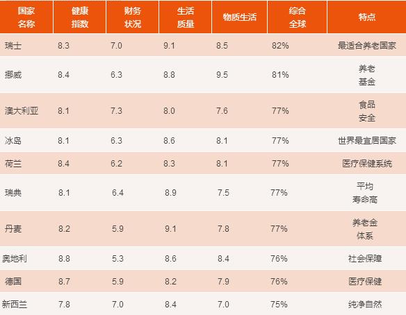法盛全球資產(chǎn)管理公司(Natixis Global Asset Management),根據(jù)世界銀行、世界衛(wèi)生組織等提供的數(shù)據(jù),從醫(yī)療環(huán)境、預(yù)期壽命、金融穩(wěn)定和生活質(zhì)量等20個(gè)方面,綜合比較了全球150個(gè)國家的養(yǎng)老情況,評(píng)出了前十名: