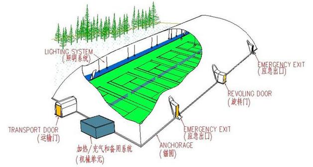 氣膜建筑也稱為“空氣支撐結構”—air supported structure,是以特殊的建筑膜材為建筑外殼,并配備一套智能化的運行控制系統(tǒng)為完全密閉的氣膜建筑內(nèi)部提供空氣壓力,使整體建筑內(nèi)部始終保持對外部環(huán)境的正壓,從而靠內(nèi)、外部壓力差把建筑主體支撐起來的一種建筑結構系統(tǒng)。一套完整的氣膜建筑系統(tǒng)還包括了照明系統(tǒng)和門禁系統(tǒng)。