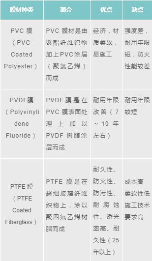 用于建筑膜結構的膜材,依涂層材不同大致可分為PVC 膜、PVDF膜和PTEF 膜,膜材的正確選定應考慮其建筑的規(guī)模大小、用途、形式,使用年限及預算等綜合因素后決定。