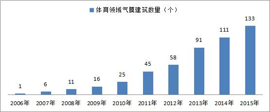 目前,世界上已經(jīng)建成有上萬個氣膜建筑了,2011年以后中國氣膜場地的數(shù)量迎來集中爆發(fā)期,全國每年新增項目數(shù)量基本穩(wěn)定在30個以上。截至2015年末,我國氣膜建筑總項目數(shù)達到215個,建筑面積達到88.76萬平方米;其中,現(xiàn)存的項目數(shù)量和建筑面積分別為197個和78.60萬平方米,現(xiàn)存率在90%左右。氣膜建筑可以應用的范圍非常廣闊,但是我國目前還是作為運動場館的比較多,市場接受度也比較高。隨著社會對環(huán)保的關注,企業(yè)經(jīng)營過程中環(huán)保的成本要求越來越高,未來在工業(yè)領域,氣膜建筑還有更廣泛的應用。