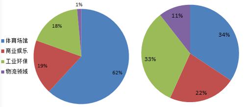 圖表4 氣膜建筑項目數(shù)量(左)、建筑面積(右)各應用領域占比