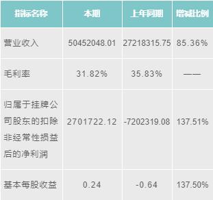 維拓環(huán)境2016年營業(yè)收入為50452048.01元,增長85.36%;毛利潤為31.82%;歸屬于掛牌公司股東的扣除非經(jīng)常性損益后的凈利潤為2701722.12元,增長137.51%;基本每股收益為0.24元,增長137.50%。